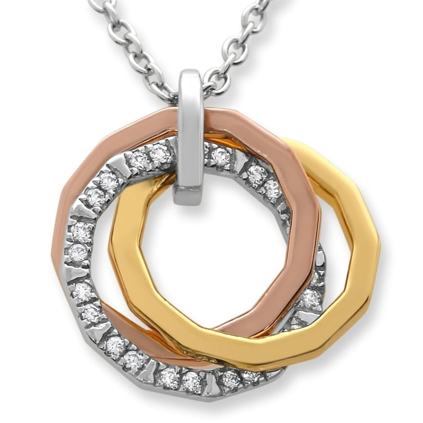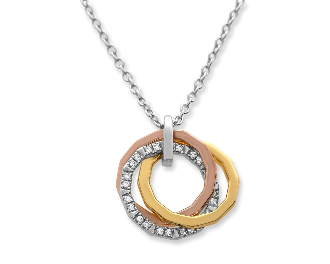 Diese Anhänger beeindrucken durch die drei miteinander verschlungenen beweglichen Ringe, welche in Juwelierqualität hochwertig vergoldet und rosé vergoldet wurden. Der silberne Ring ist rundherum mit herrlich funkelnden Zirkonia besetzt, so dass diesen den Anhänger facettenreich strahlen lässt. Durch die tricolore Farbgebung passt der Anhänger zu zahlreichen Outfits, vielfältigen Looks und wird sicherlich alle Blicke auf sich ziehen. Die Kette ist ca. 45 cm lang und hat eine Zwischenöse bei einer Länge von ca. 42 cm, sodass die Kettenlänge variiert werden kann.